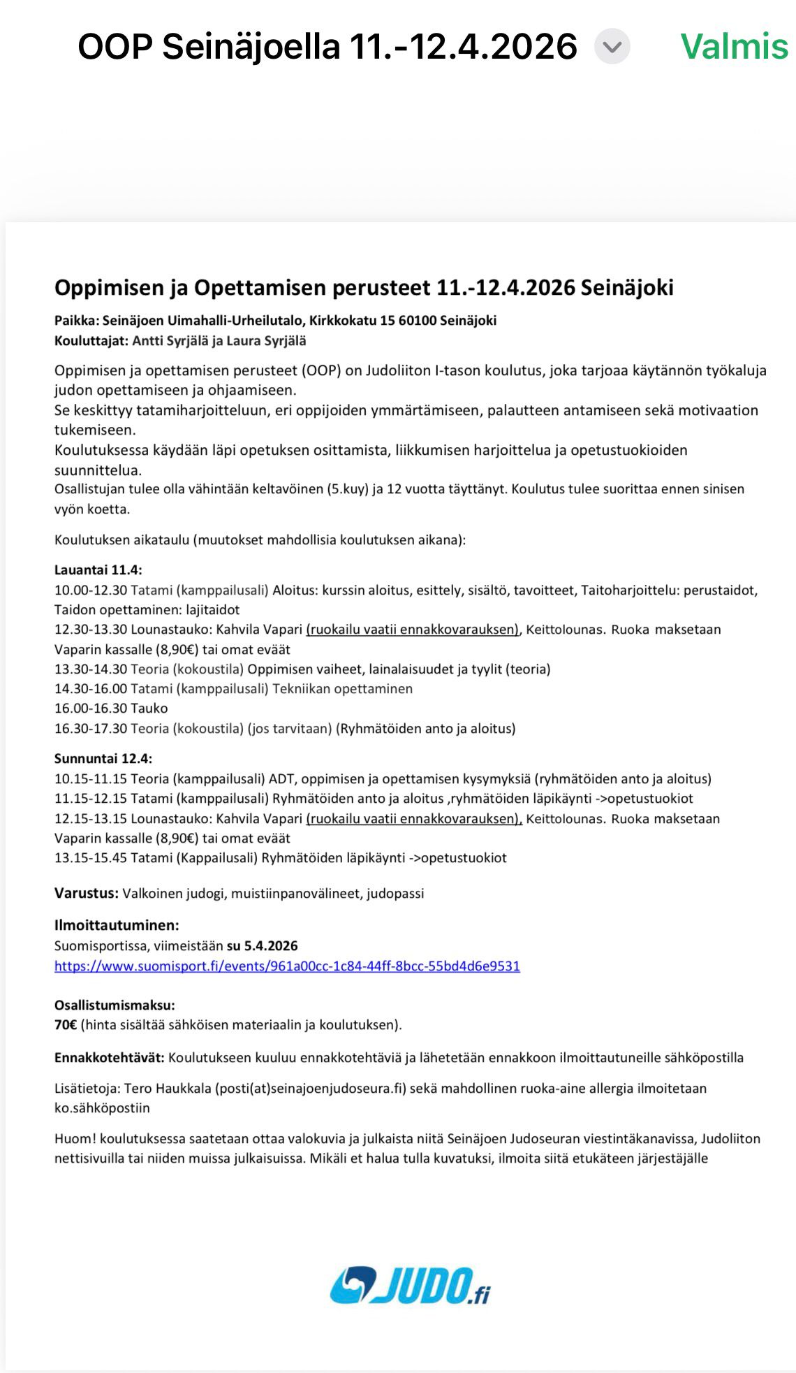 Huom Vihreät vyöt! Tämä kurssi on pakollinen siniseen vyöhön. Kannattaa suorittaa hyvissä ajoin, koska tätä ei välttämättä järjestetä alueellamme joka vuosi. Ilmoittautuminen 5.4. mennessä. Jokainen hoitaa itse ilmoittautumisen ja maksun.