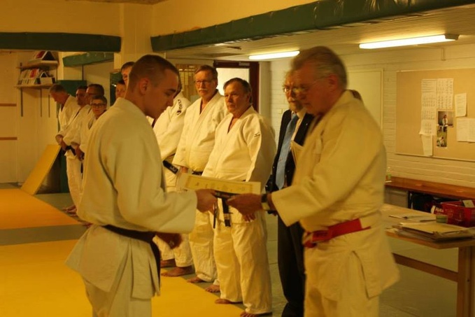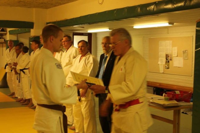 ![]() Jorma Kivinen 8.d ojentaa Anttonille dan –diplomin. |